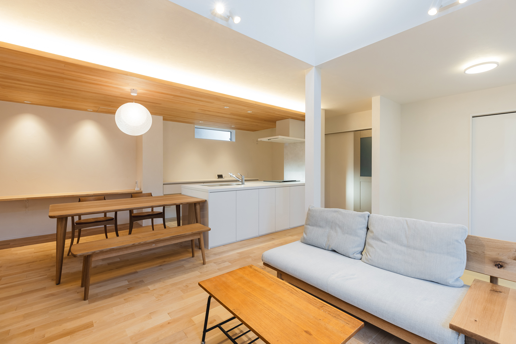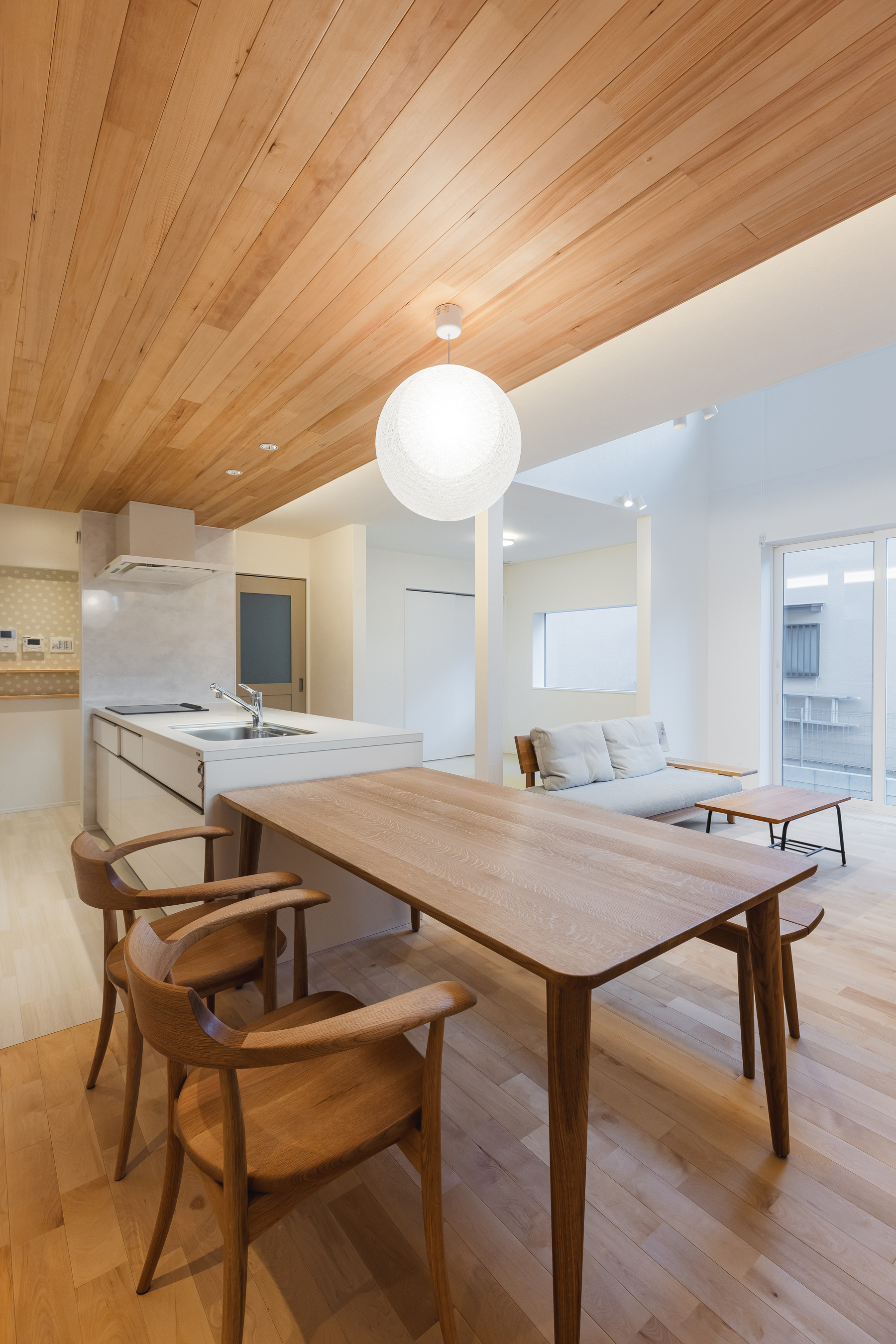 キッチン本体とダイニングテーブルを直線配置、奥様こだわりアイランドキッチン、天井もお洒落に!
